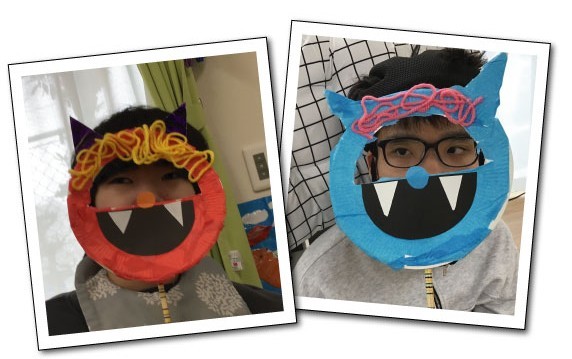 2月の節分に向けて1月から紙皿に角つけて、色紙を貼って、毛糸で髪の毛を付けて…とコツコツと作ってきました。こんな可愛いオニだったら、どんないたずらでも許してしまいそうです。